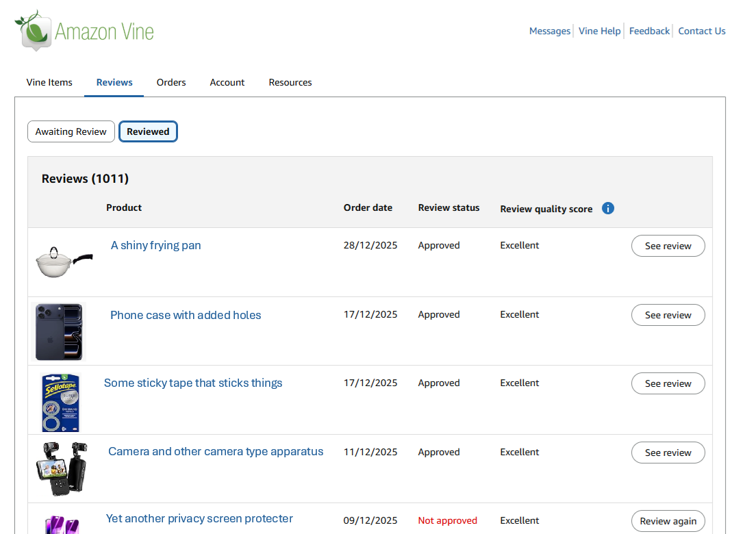This page explains what the browser extension can do with your Vine reviews. If you're not a member of Amazon Vine, then these details won't apply to you, so you can head back to the main page.